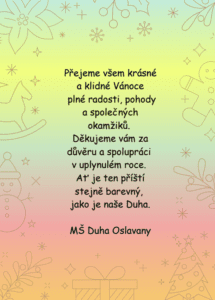 Provoz mateřské školy na všech pracovištích (Sportovní, Havířská, Padochov) končí v pátek 19.12.2025. Znovu budou všechna pracoviště MŠ otevřena 5.1.2026.